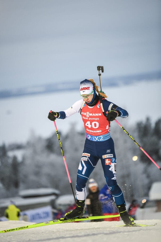 Suvi Minkkinen selvitti ensimmäiset kolme ammuntaa puhtaasti, mutta ampui viimeisellä pystypaikalla kaksi ohilaukausta. 40:ntenä matkaan lähtenyt Minkkinen jäi maalissa voittajasta neljä minuuttia ja 18 sekuntia.