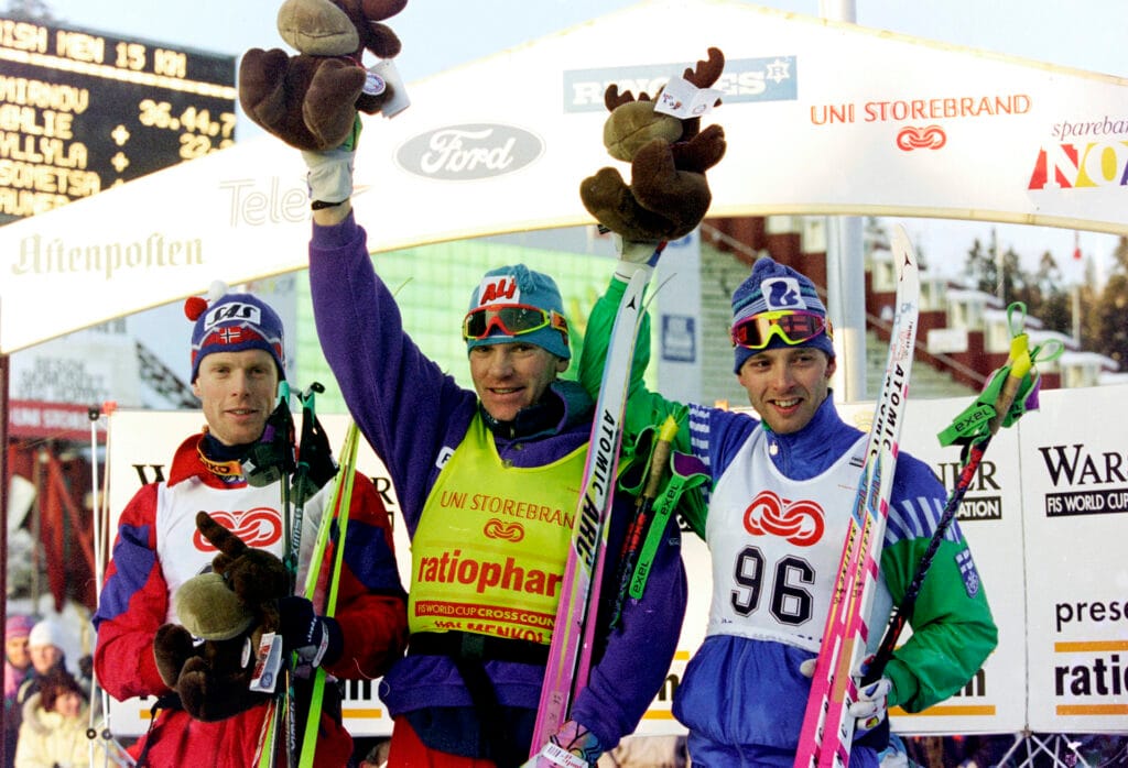 Aikakautensa kolme suurta hiihtäjää: Bjørn Dæhlie, Norja, Vladimir Smirnov, Venäjä ja Mika Myllylä. Kuva: BILDBYRÅN