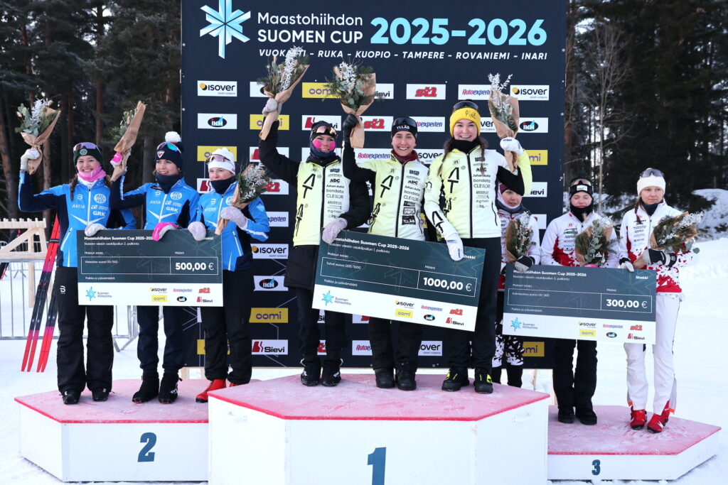 Naiset, 3×5 km: 1) AT Ski Team (Olivia Puranen, Emmi Lämsä, Vilma Jylhä) 36.47,8, 2) Vantaan Hiihtoseura (Hanna Ray, Elsa Torvinen, Eevi-Inkeri Tossavainen) -5,9, 3) Tampereen Pyrintö (Amanda Yli-Futka, Amanda Saari, Eveliina Piippo) -16,6, 4) Ski Team Iisalmi -26,9, 5) Pohti SkiTeam -1.40,0, 6) Tampereen Pyrintö II -2.08,6.