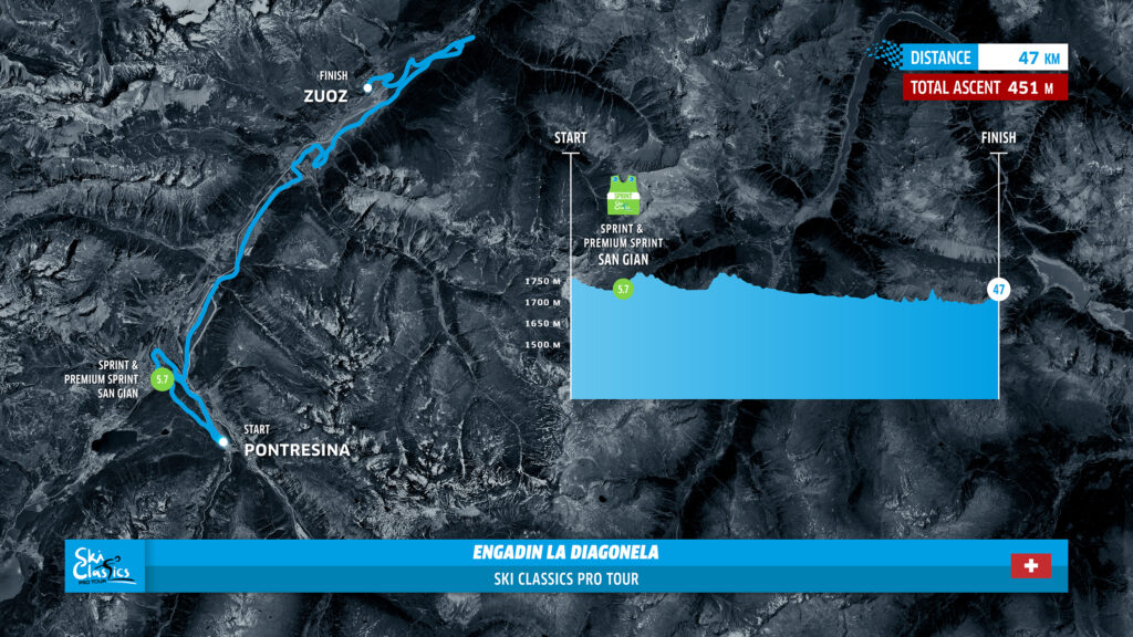 Viime viikkojen vähäisen lumisateen vuoksi paikallinen järjestelytoimikunta (LOC) on lyhentänyt kilpailumatkaa 55 kilometristä 47 kilometriin. Päivitetty reitti alkaa Pontresinasta ja sisältää kaksi avauskierrosta, joista kumpikin on 9 kilometriä. Kierrokset kulkevat Celerinan ja Traumloipe Pontresinan kautta ja palaavat takaisin Pontresinaan. Molemmilla avauskierroksilla on vaativa nousu. Tämän jälkeen kilpailu jatkuu perinteistä reittiä pitkin maaliin Zuozissa.